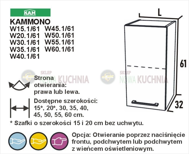 Szerokość szafki do wyboru: 15, 20, 30, 35, 40, 45, 50, 55 i 60 cm (szafka 15 cm i 20 cm jest bezuchwytowa)